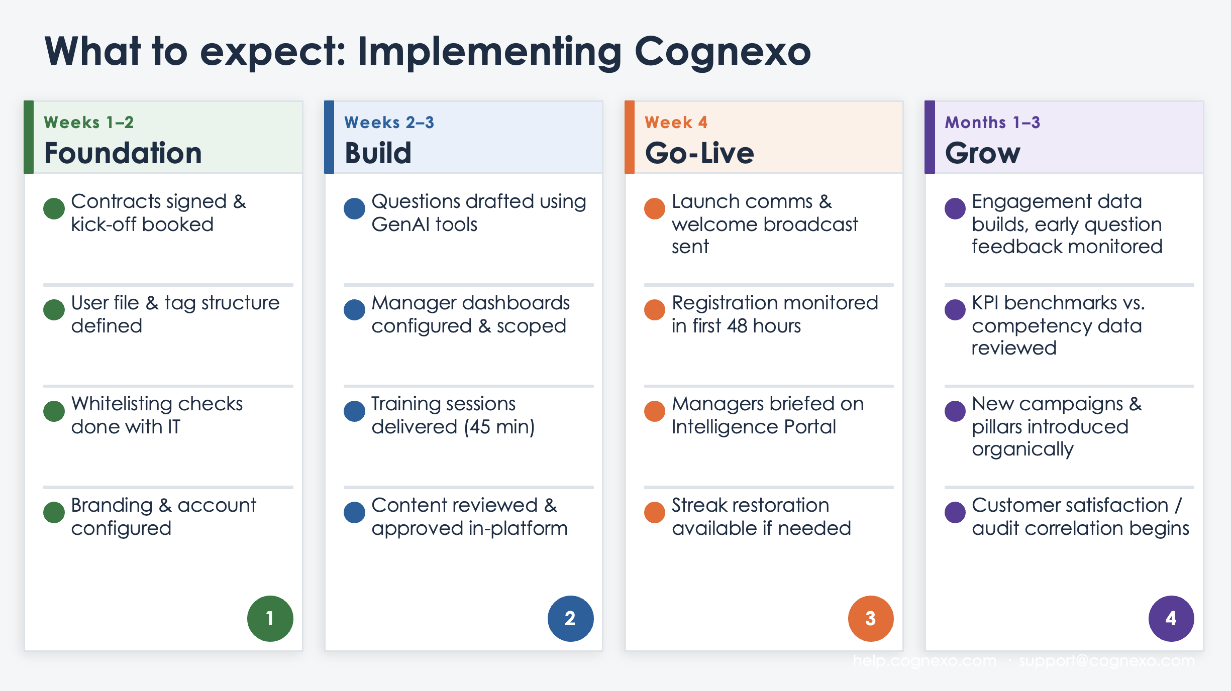 - Agree Which Pillars to Activate at Launch: Cognexo has four pillars: Develop (knowledge reinforcement), Broadcast, Assess, and Survey. Most clients launch with Develop first and introduce the others organically as engagement builds. Discuss with your CSM which pillars are appropriate from day one — there is no need to activate everything at once.