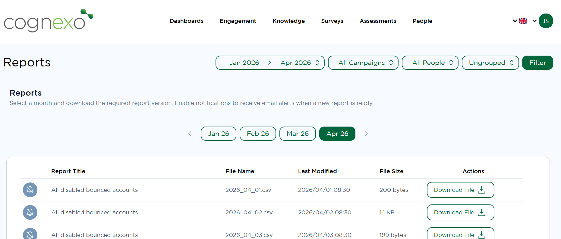 The Reports section in Cognexo provides access to auto-generated reports with flexible viewing options: