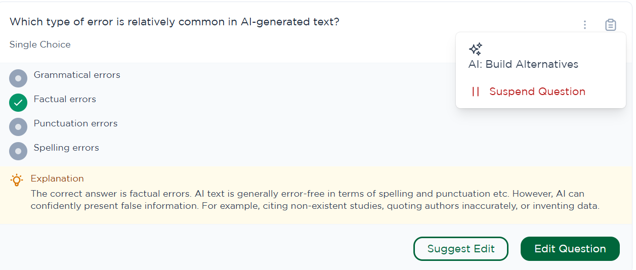 If a question needs to be temporarily or permanently removed from circulation, you can suspend it by either clicking the three dots in the right hand corner of this page and pressing 'Suspend Question' or you can directly go into each individual question via 'Edit Question' to suspend.