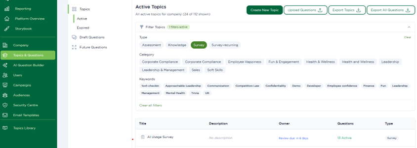 If a user needs permission to see Survey data, start by clicking Topics and Questions in the Management Portal and click on the survey:
