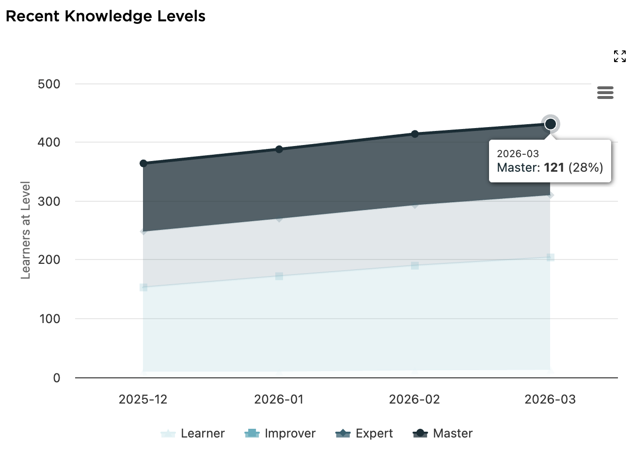 Tracking knowledge levels over time tells you whether your team's competency is genuinely improving. You want to see the Expert and Master bands growing month on month, with fewer learners staying in the Learner band over time.