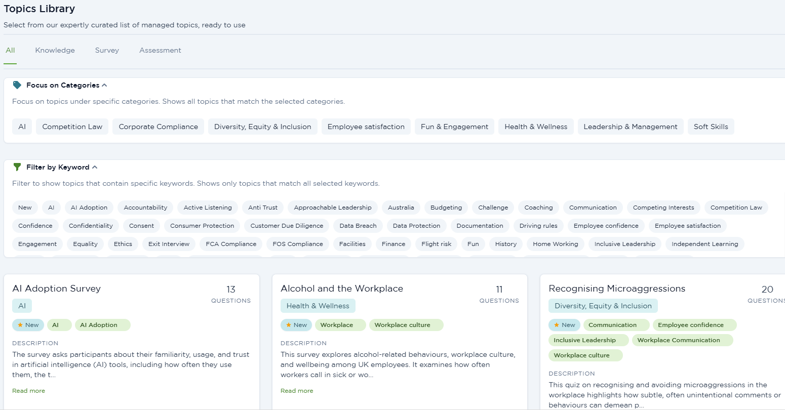 The Topics Library is available in the Cognexo Management Portal for Admin users. It provides a portfolio of ready-made, expertly curated, and managed topics that can be added directly into your organisation’s Cognexo instance.